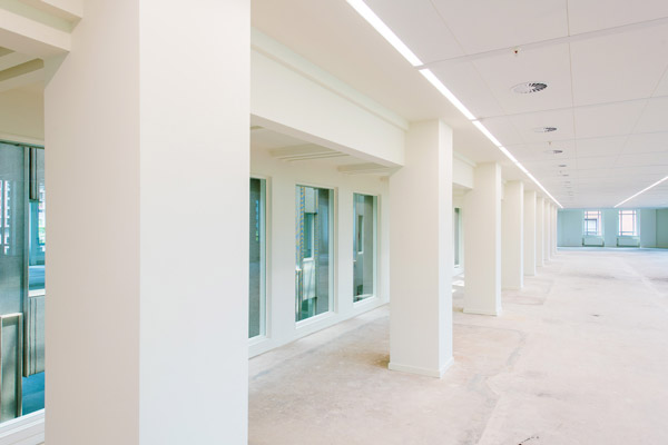 In korte tijd moest in een multigedisciplineerd team worden samengewerkt om een zeer hoog afwerkniveau te behalen. Houten kozijnen en deuren werden geschilderd, net als de staalconstructie op de bovenste verdieping. Radiatoren zijn gespoten voor een strakke uitstraling. Cassetteplafonds - die je niet kunt rollen - zijn gespoten. Alle wanden zijn voorzien van muurverf.